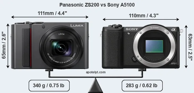 La Panasonic Lumix DC-ZS200 e la Sony Alpha A5100 sono due fotocamere digitali rivelate al pubblico rispettivamente a febbraio 2018 e agosto 2014. Il ZS200 è una fotocamera compatta con obiettivo integrato, mentre A5100 è una fotocamera mirrorless con obiettivo intercambiabile. Le fotocamere sono dotati di un sensore da 1 pollice (ZS200) e un sensore APS-C (A5100). La Panasonic ha una risoluzione di 20,0 megapixel, mentre la Sony fornisce 24,0 MP.