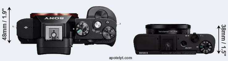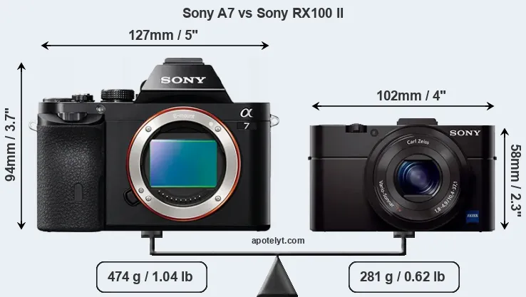 La Sony Alpha A7 e la Sony Cyber-shot DSC-RX100 II sono due fotocamere digitali rivelate al pubblico rispettivamente a ottobre 2013 e giugno 2013. Il A7 è una fotocamera mirrorless con obiettivo intercambiabile, mentre RX100 II è una fotocamera compatta con obiettivo integrato. Le fotocamere sono dotati di un sensore full frame (A7) e un sensore da 1 pollice (RX100 II). La A7 ha una risoluzione di 24,0 megapixel, mentre la RX100 II fornisce 20,0 MP.
