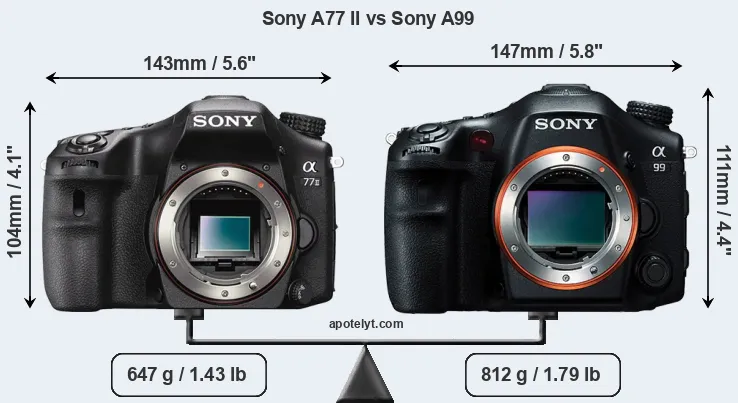 La dimensione fisica e il peso della Sony A77 II e Sony A99 sono illustrate nel grafico sottostante. Le due fotocamere vengono visualizzate in base alle loro dimensioni relative. Tutte le dimensioni sono arrotondate al millimetro più vicino.